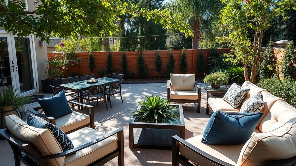 Choosing durable patio furniture starts with understanding the materials used. High-quality options like powder-coated steel, weather-resistant PE wicker, and solid Acacia wood are built to withstand outdoor elements, ensuring longevity. Selecting materials with UV-resistant and fade-proof finishes can profoundly extend your furniture’s lifespan, even under direct sunlight. Well-crafted cushions with removable, washable covers made from durable fabrics add comfort and simplify maintenance. Weatherproof features such as rust-proof frames and water-resistant wicker help prevent corrosion, cracking, and deterioration over time. Additionally, sturdy construction techniques and premium materials minimize wobbling, cracking, or structural failure. By prioritizing these durable, high-quality materials, you’ll invest in furniture that remains attractive and functional for years, making your outdoor space both beautiful and resilient.