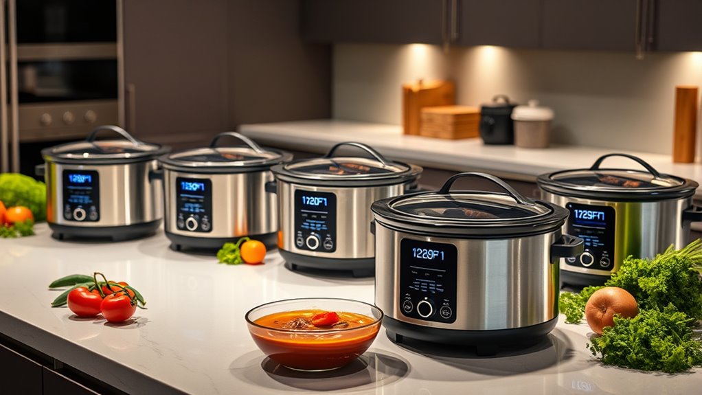 If you’re looking for the top premium slow cookers with WiFi in 2025, I’ve got you covered. These smart appliances combine advanced cooking tech with app control, offering features like precise temperature management, versatile modes, and large capacities for family meals. They help simplify meal prep and make cooking more convenient. If you’re curious about the best options, keep going—you’ll find all the details you need to choose the perfect one.