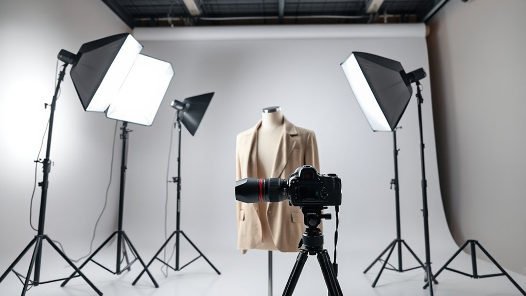 If you’re looking to elevate your photography game, I’ve found that premium studio lighting kits like the Neewer, Torjim, and Lume Cube options provide high-quality softboxes, LED panels, and versatile support systems. These kits feature adjustable brightness, color temperature, and sturdy support stands, making them suitable for professional portrait, product, or video shoots. Keep exploring to discover more about these top setups and how they can transform your shoots into stunning visuals.