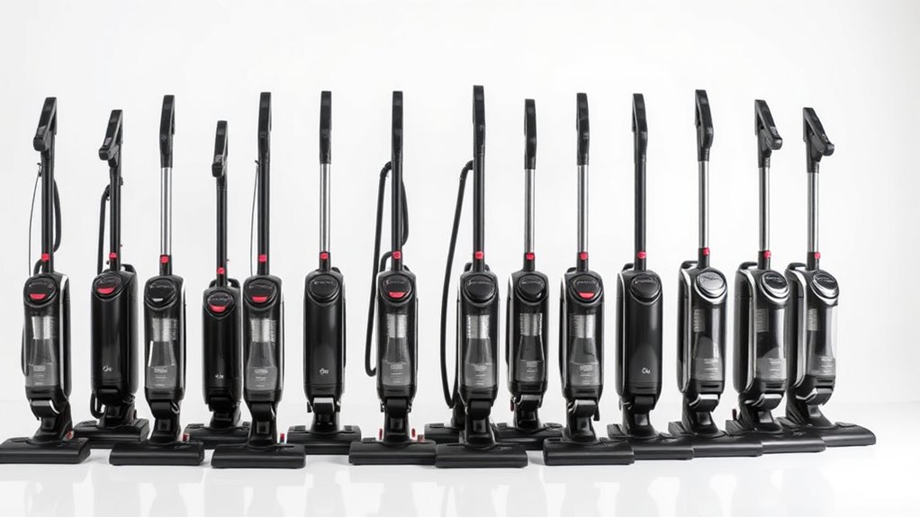 Since higher suction power levels directly impact how effectively a vacuum removes embedded dirt, pet hair, and debris, evaluating this feature carefully is vital. Stronger suction ensures thorough cleaning across carpets, hardwood, and porous surfaces. It’s typically measured in inches of water lift or airflow (CFM), with higher values indicating better performance. Premium vacuums often include adjustable suction controls, letting you optimize power for different tasks and surfaces. This flexibility helps prevent damage to delicate floors while deep-cleaning carpets. Keep in mind, maintaining suction strength requires regular filter and brushroll cleaning, especially in models with sealed HEPA filters. Overall, powerful suction is key to achieving cleaner indoor air and a more efficient, effective cleaning experience.