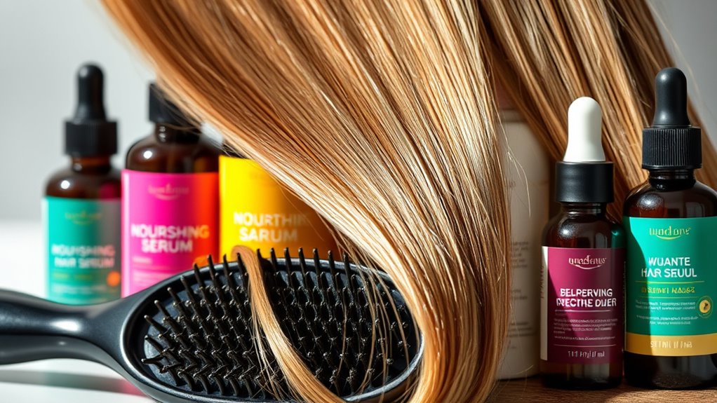 Choosing the right product to repair dry, damaged hair starts with understanding your specific hair type. Whether you have curly, straight, fine, or coarse hair, selecting formulations designed for your hair type ensures better results. If your hair is chemically or color-treated, look for products made to protect and preserve your treatment. Ingredients matter too—keratin can strengthen, while oils provide necessary moisture—so pick formulas that address your hair’s unique needs. Also, consider the texture and consistency; lightweight serums work well for fine hair, while richer masks suit thick, coarse hair. Ultimately, check the pH level to ensure it’s compatible with your scalp’s health, preventing further dryness or imbalance. Matching products to your hair type is essential for effective, lasting repair.