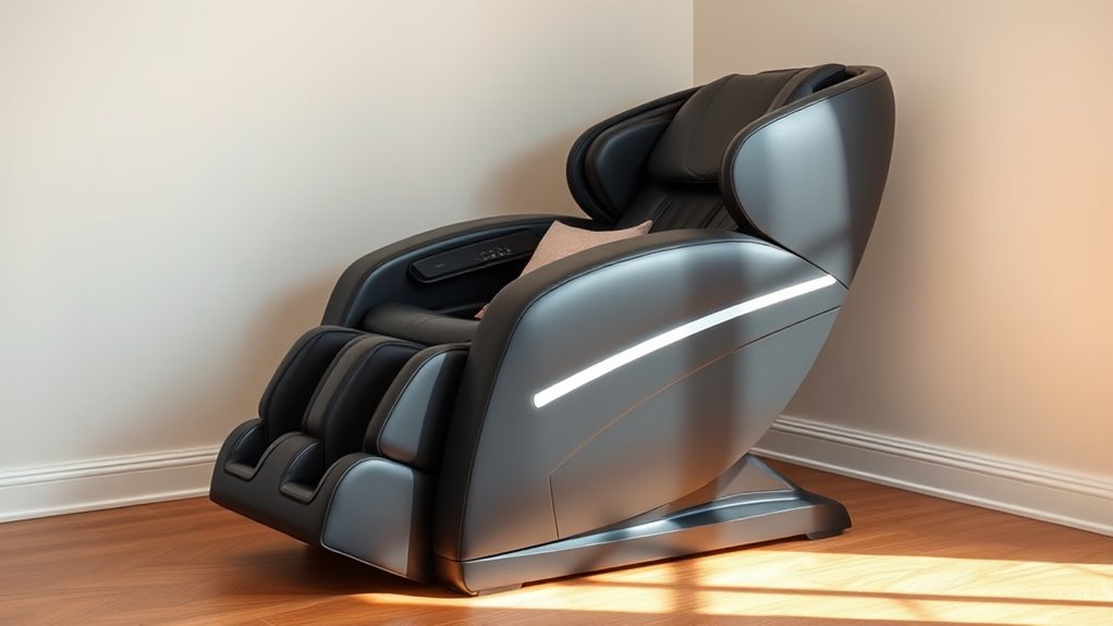 Different massage technology types offer distinct relaxation benefits, making it important to contemplate which ones suit your needs best. Shiatsu massage rollers mimic finger pressure, targeting deep muscle layers for a deep tissue experience. Kneading and rolling techniques work together to loosen tight muscles and enhance circulation. Airbag compression uses strategically placed airbags to gently squeeze and knead, perfect for relieving tension and improving blood flow without noise. Vibration massage delivers oscillating movements that soothe muscles and promote relaxation while remaining quiet. Many chairs combine multiple technologies, allowing you to customize your experience. When choosing a quiet massage chair for your apartment, consider which methods provide the most comfort and relaxation without disturbing your space. The right combination ensures effective relief and a peaceful environment.