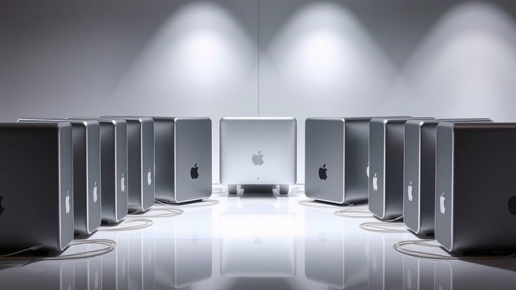 Renewed Mac Pro desktops generally offer comparable performance to new models, but with some differences in hardware freshness. I find that they handle demanding tasks just as well, thanks to high-quality components. The main advantage is cost savings, making them a smart choice if you’re okay with slightly older hardware. However, I recommend checking for recent updates to guarantee you’re getting the best performance possible for your needs.