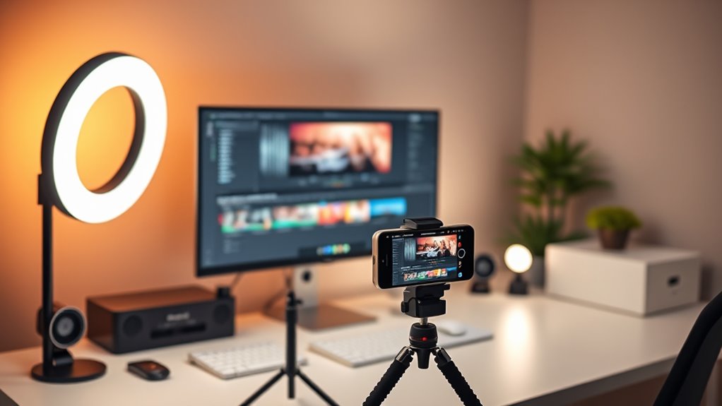 If you want to elevate your videos in 2025, I recommend checking out the top ring lights designed for content creators. These lights offer adjustable brightness, multiple color modes, high CRI for natural skin tones, and versatile mounts to suit all setups. Many models also include remote controls and portable stands, making them perfect for selfie videos or professional shoots. Want to find the perfect ring light? Keep exploring to discover the best options.