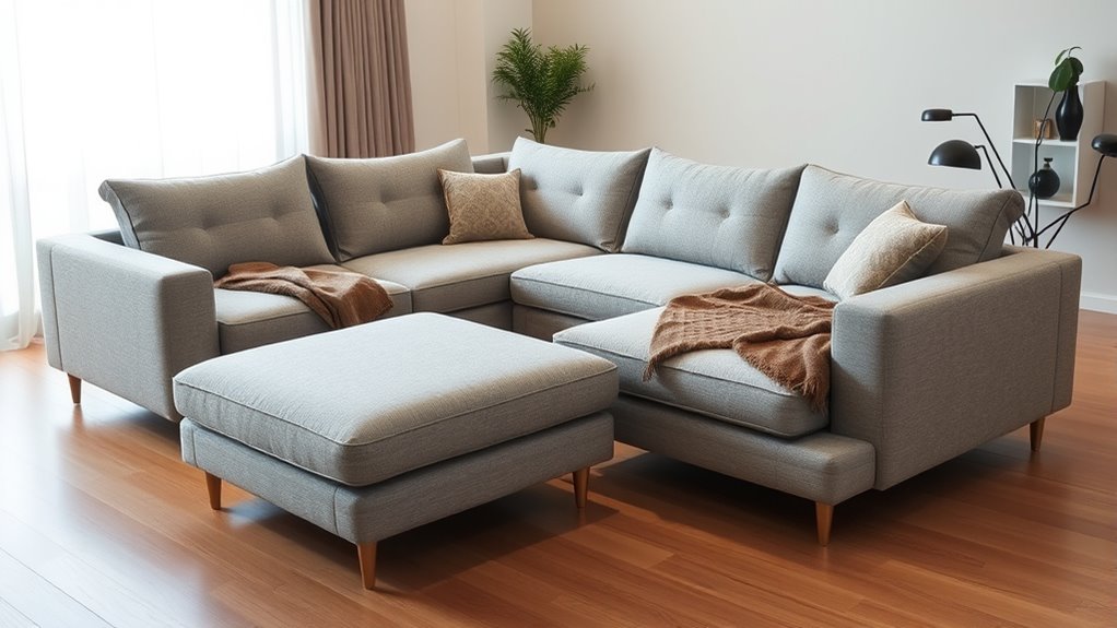 Flexibility in sectional sofa configurations is essential to making the most of your space and adapting to changing needs. Modular sectional sofas let you customize layouts like L-shape, U-shape, or straight arrangements, perfect for different room sizes. Reconfigurable designs make it easy to add, remove, or rearrange sections without tools, so you can switch up your setup whenever you want. Many models feature interchangeable modules that can transform into beds, loungers, or open seating areas, offering even more versatility. These adaptable configurations help optimize space in small apartments or open-concept rooms while providing functional options for entertaining or everyday use. Ultimately, choosing a sectional with flexible setup options guarantees your furniture evolves with your lifestyle and space requirements.