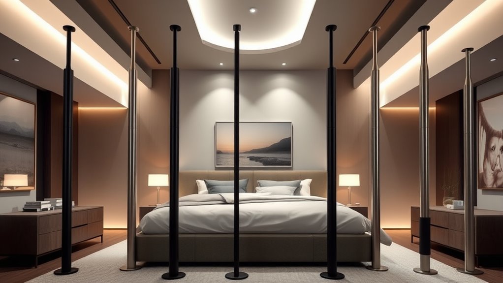 When I’m choosing a floor-to-ceiling security pole for my bedroom, I focus on a few key factors. I always check the weight capacity and height adjustability to guarantee it fits my needs, and I look for easy installation methods. Durability and stability are also vital for safety, so I don’t compromise on quality materials.