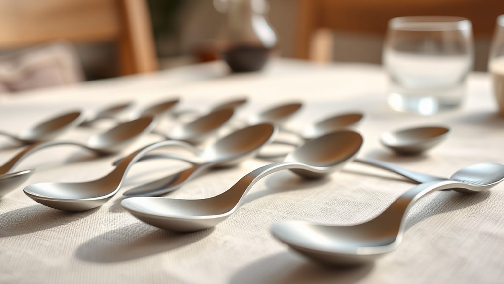 Adaptive spoons designed specifically for Parkinson’s patients can substantially enhance meal times, especially for those struggling with hand tremors or limited mobility. I’ve found that these silverware adaptive spoons, made from stainless steel, are perfect for everyday use. Their ergonomic design makes scooping easier, and the flat-edged spoons improve contact with food, reducing the effort needed. Weighing just 1.5 oz for the cooking spoon, they’re lightweight yet durable and dishwasher safe. Using these utensils not only boosts my independence during meals but also makes food preparation more manageable. It’s truly a game-changer for enjoying meals with confidence!