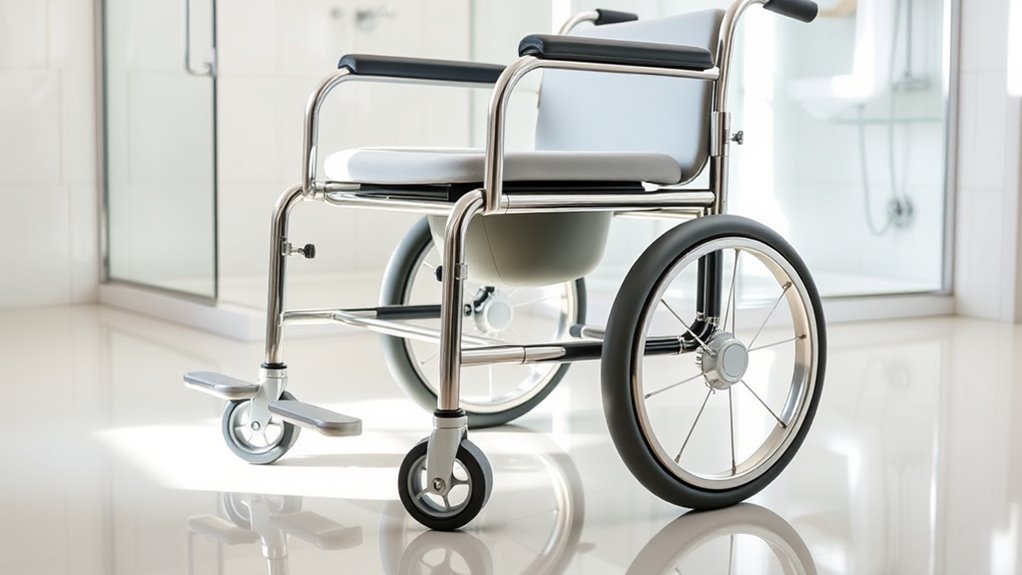 Choosing a shower commode wheelchair that offers ideal comfort is vital, especially since extended use can be tiring. I look for models with higher-density foam or padded seats, as they provide better support and prevent discomfort over time. Ergonomic armrests and backrests are essential, offering support that reduces fatigue and helps maintain proper posture. Waterproof, cushioned surfaces keep comfort intact despite exposure to moisture and frequent cleaning. Adjustable features like height and tilt allow me to customize the fit, making sitting more comfortable and reducing strain. Well-designed padding that contours to the body helps prevent pressure sores and ensures a more pleasant long-term sitting experience. Prioritizing these comfort factors ensures I can use the wheelchair confidently and comfortably during daily routines.
