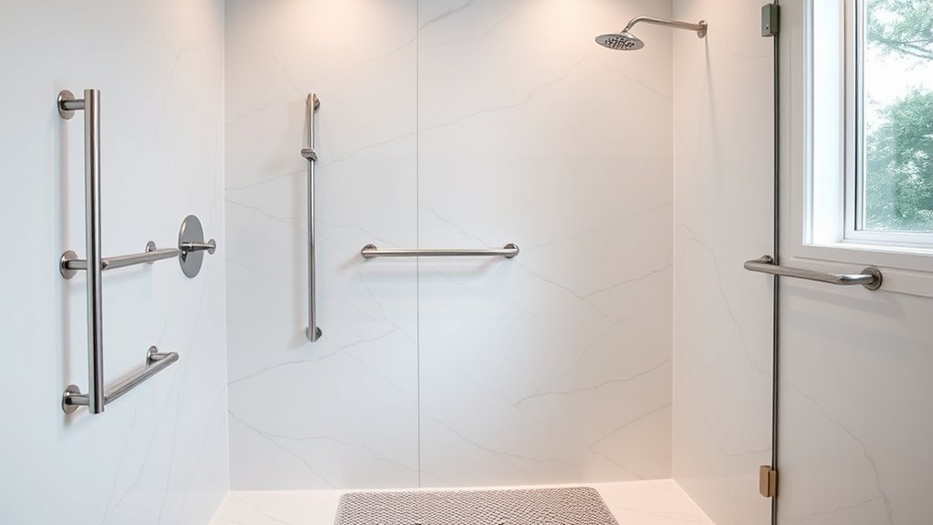 After considering the load capacity and strength of grab bars, the next thing to focus on is the material durability and corrosion resistance. I always recommend choosing grab bars made of stainless steel or high-quality, corrosion-resistant materials. These options guarantee longevity in wet environments like showers. Look for materials with nickel brushed or textured finishes, as they provide slip resistance and help prevent rust. I’d advise against plastic or low-grade metals since they can degrade, crack, or corrode quickly when exposed to moisture. It’s also essential to verify that the material supports a high weight capacity—aim for at least 250 pounds. Properly rated materials that meet ASTM or ADA standards are designed to withstand harsh bathroom conditions without losing strength.