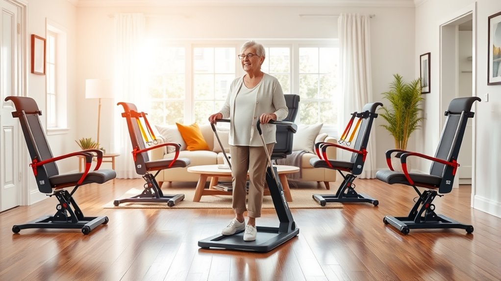 Safety features are essential when evaluating sit-to-stand lifts for seniors, as they directly impact stability and protection during transfers. Dual locking brakes are indispensable, preventing unwanted movement and ensuring the lift stays securely in place. Frame hooks and side support straps add extra stability, giving both the user and caregiver confidence. Non-slip footrests and padded handrails help reduce slips, falls, and injuries. Adjustable components ensure a snug fit for different users, enhancing safety during each transfer. Critical safety features like emergency lowering mechanisms provide peace of mind, allowing quick descent in emergencies. Battery backup functions ensure reliable operation even during power outages. By prioritizing these safety features, you can choose a lift that offers maximum security, reducing risks and promoting safe, confident transfers at home.