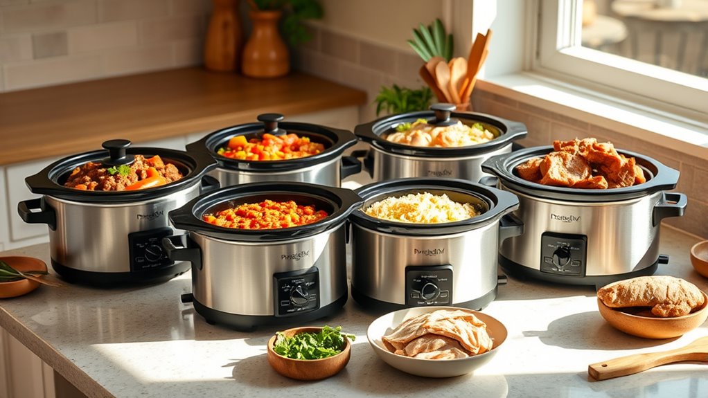 Having multiple cooking settings on a slow cooker provides the flexibility needed to prepare a variety of family meals with ease. With options like low, high, and warm, I can easily adjust the temperature to suit different recipes and schedules. Some models even include modes like searing, baking, or steaming, which add multi-functional capabilities in one appliance. Adjustable timers and programmable controls give me precise control over cooking times, ensuring meals are ready when I need them. The keep-warm feature is a lifesaver, maintaining food at a safe serving temperature without overcooking. Digital control panels and preset programs make operation straightforward, helping me achieve consistent results with minimal effort. These settings make slow cookers adaptable to diverse family favorites and busy lifestyles.