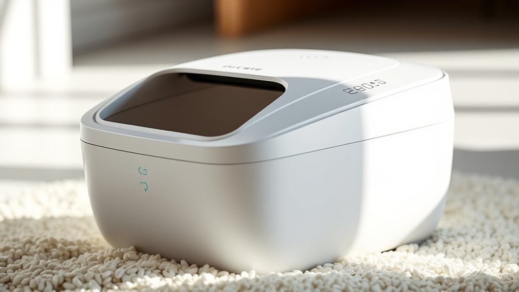 Safety features are essential to guarantee your cat’s well-being while using a smart litter box. Infrared sensors and weight detectors are fundamental, as they prevent the unit from operating when a cat is inside, reducing injury risk. Anti-pinch mechanisms stop the cleaning cycle if any obstruction or unexpected movement is detected, protecting pets from pinching or trapping. Automatic pause functions activate if sensors sense a cat approaching or touching the unit during cleaning, ensuring safety. Proper placement on flat, stable surfaces and regular maintenance of sensors are crucial to prevent malfunctions. Additionally, some models include emergency stop buttons or manual override options, allowing you to halt operation immediately if necessary. Prioritizing these safety features keeps your pet secure and gives you peace of mind.