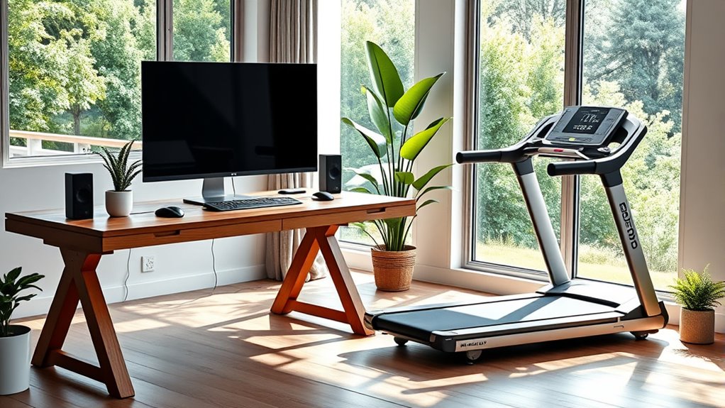 Choosing the right smart treadmill desk setup starts with understanding your space. I recommend measuring your available floor area to ensure the treadmill fits comfortably without blocking walkways or furniture. Pay attention to the treadmill’s dimensions—length, width, and height—to see if it aligns with your desk setup and room layout. If space is tight, consider compact or foldable models that can be stored easily when not in use. Also, check the clearance height needed for safe operation, especially if placing the treadmill under a desk or bed. Finally, make sure there’s enough room for safe movement around the treadmill, allowing you to walk or run comfortably without feeling cramped. Proper space planning guarantees a safer, more functional workout and work environment.