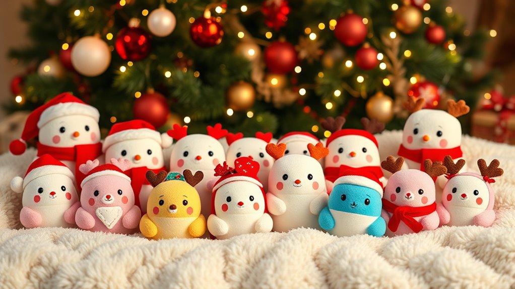When choosing the perfect Squishmallows for the holidays, I consider factors like size and dimensions to suit my space, along with age appropriateness for the recipient. I also look at seasonal designs that capture the holiday spirit and check for collectibility value if I want something special. Finally, I pay attention to material quality to guarantee durability and softness for long-lasting cuddles.