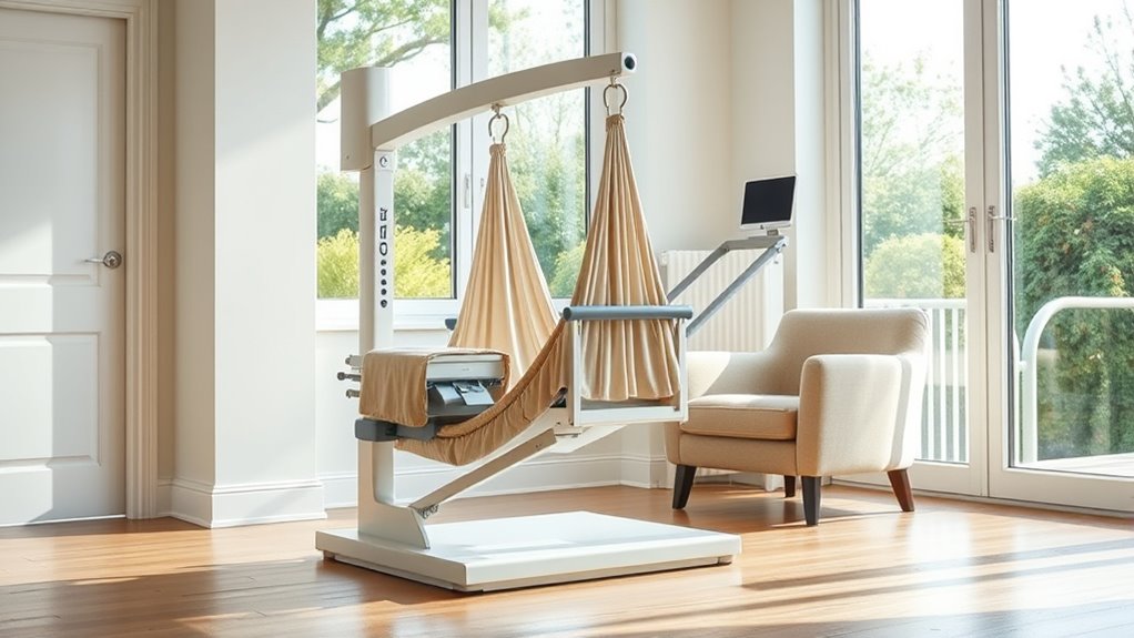 When selecting a patient lift for home use, portability and storage are crucial factors to contemplate. A lightweight lift, ideally under 100 pounds, makes transportation and maneuvering easier. Foldable or collapsible designs help save space and simplify storage, especially in small or cluttered areas. Compact lifts with adjustable bases can fit through standard doorways and narrow hallways, ensuring accessibility throughout your home. Removable or rechargeable batteries add convenience, allowing use without constant access to power outlets and making travel simpler. Features like carrying handles, lightweight frames, and compact dimensions enhance handling and storage. Ultimately, choosing a lift that’s easy to move, store, and transport ensures you get the most practical and hassle-free experience in managing care at home.
