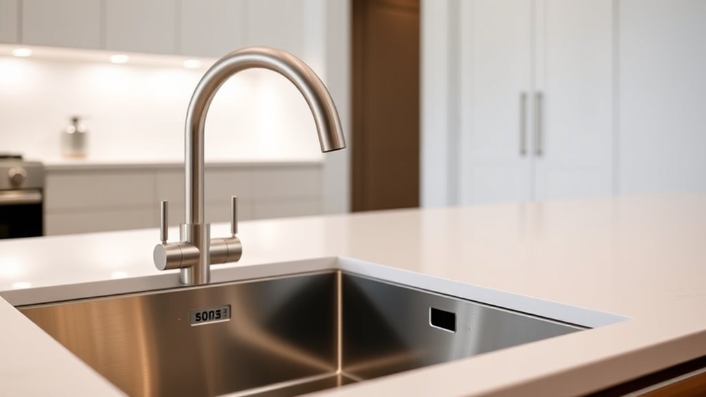 Ensuring your touchless kitchen faucet meets water efficiency standards is essential for conserving resources and lowering utility bills. I recommend choosing models that comply with EPA WaterSense standards, which guarantee at least 20% water savings compared to conventional faucets. Look for faucets with flow rates of 1.8 GPM or lower to maximize efficiency without sacrificing performance. Verify that the faucet has automatic shut-off sensors or timers to prevent continuous flow and reduce waste during prolonged use. Certifications like NSF 61 or CSA indicate the faucet meets strict water safety and quality standards, promoting responsible water use. Additionally, consider models equipped with integrated aerators or flow restrictors—these technologies limit water flow while maintaining adequate pressure, ensuring both efficiency and functionality.