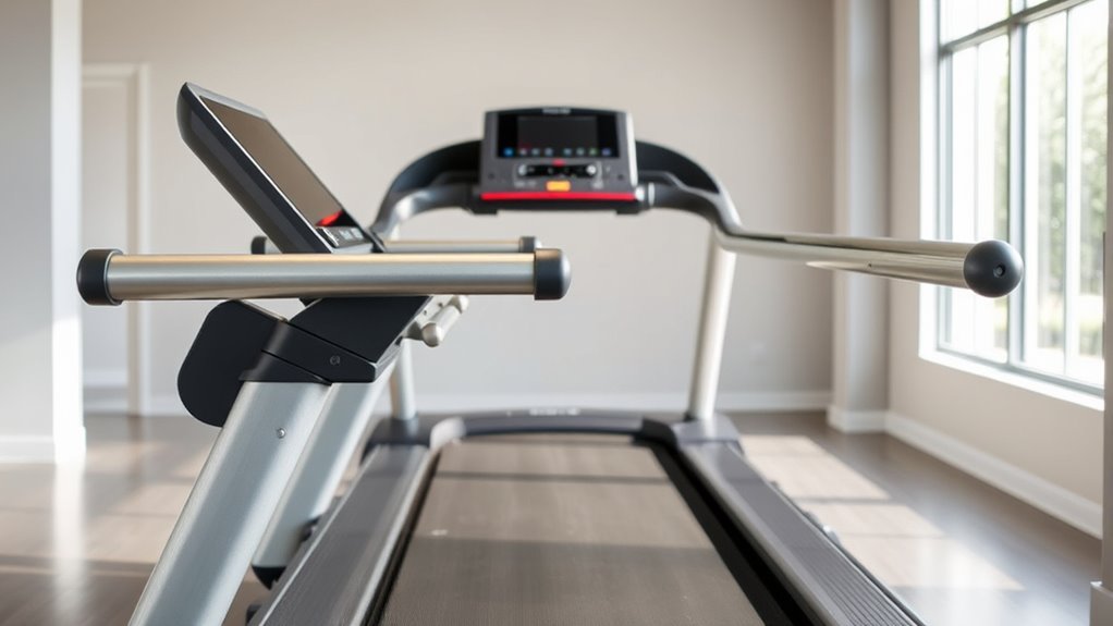 Considering the safety features of a treadmill is essential, especially for seniors with long handrails. These features provide crucial stability and support, reducing fall risk and boosting confidence during workouts. Magnetic safety keys are vital—they instantly stop the machine if detached, preventing injuries. Emergency stop buttons and quick-access controls make operation safer, especially for those with limited mobility. Shock absorption systems in the belt and deck help minimize joint strain, promoting low-impact exercise that’s safer for aging joints. Non-slip surfaces and stability aids further enhance security, giving seniors a firm footing. Prioritizing these safety features ensures a safer, more comfortable workout environment, helping seniors stay active without unnecessary risks. Safety features are not just added extras—they’re essential for a secure, injury-free exercise experience.
