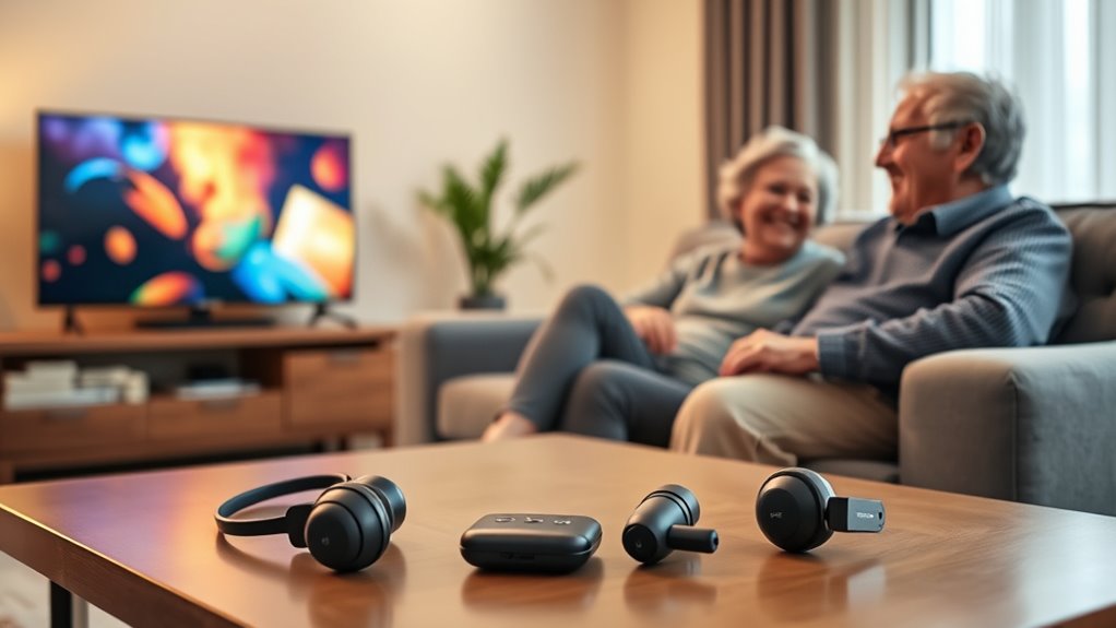 To truly enjoy your favorite shows, sound clarity and quality are vital, especially for seniors with hearing impairments. I’ve found that clear sound with minimal distortion helps distinguish speech from background noise, making dialogue much easier to follow. High-frequency amplification is essential, as it enhances consonants and overall speech intelligibility. Features like noise reduction and voice highlighting can greatly improve dialogue clarity by reducing distracting sounds. I also appreciate devices that offer customizable tone and volume controls, allowing me to tailor the audio to my specific hearing needs. Ultimately, low-latency wireless technology ensures that the audio syncs perfectly with the on-screen action, which prevents those annoying lip-sync issues and enhances my viewing experience.