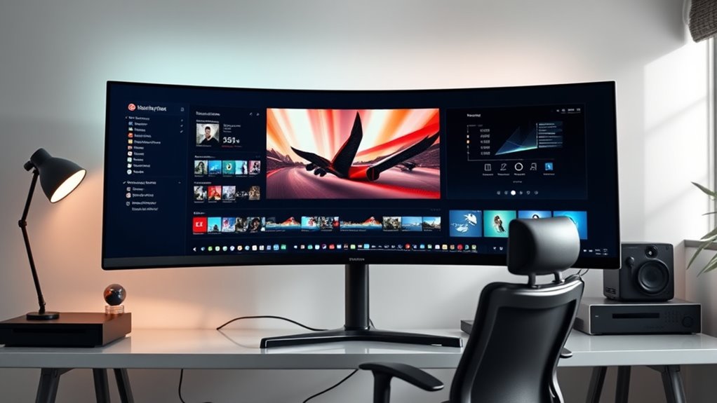 When choosing an ultrawide monitor for video editing and multitasking, I focus on key factors like screen size, resolution, and color accuracy to guarantee sharp visuals. Connectivity options and ergonomic adjustments also matter to create a comfortable, efficient workspace. Additionally, I consider the display’s curvature level to balance immersion with comfort during long work sessions.
