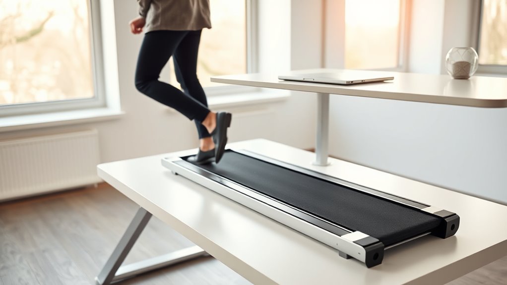 Selecting an under-desk treadmill that fits comfortably into your workspace starts with understanding its size and how well it integrates with your existing desk setup. Measure your desk’s dimensions and available space to guarantee the treadmill won’t cause obstruction or crowd your area. Check the belt width, which typically ranges from 16 to 20 inches, to make sure it accommodates your gait comfortably and safely. Also, verify the treadmill’s maximum weight capacity—usually between 220 and 450 pounds—to match your body weight for safe use. Confirm that the treadmill’s height adjustment range aligns with your standing desk, ensuring ergonomic comfort. Finally, consider the footprint when the treadmill is both extended and stored, so it seamlessly fits into your workspace without hindering movement or productivity.