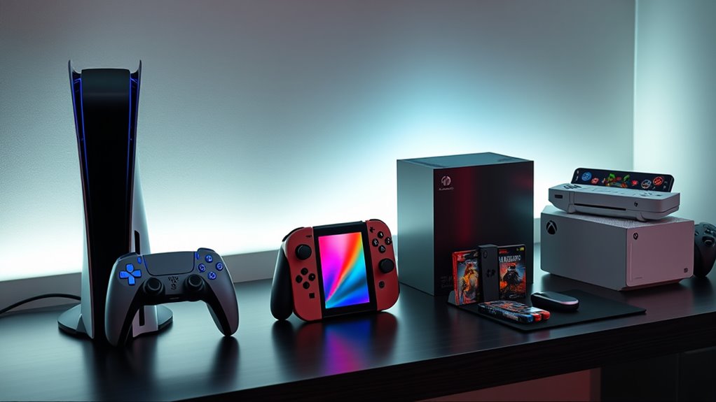 If you’re looking to upgrade your gaming setup, there’s a great mix of options for everyone. From retro handheld consoles with thousands of classic games to modern all-in-one systems that connect to your TV, you’ll find something to match your style. Budget-friendly bundles and premium consoles like the PlayStation 5 also make the cut. Keep exploring to uncover the best picks for your gaming life and find out what suits you best.
