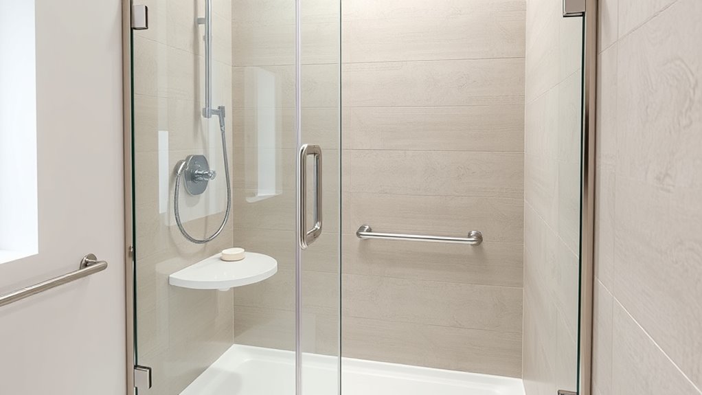 Yes, there are plenty of options for grab bars and safety rails that blend seamlessly into your shower. I’ve seen sleek stainless steel bars that look modern yet sturdy, and even stylish, painted rails that match your decor. Installing these provides extra support and confidence, especially for aging in place. They’re easy to add during installation or upgrade later, turning your shower into a safe, stylish refuge.