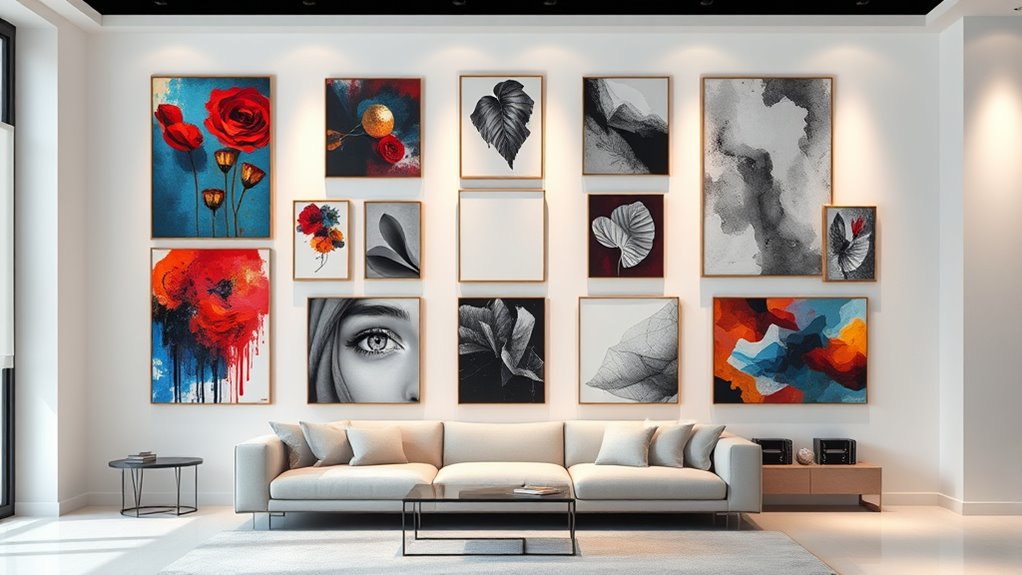 Achieving a harmonious look in your living room starts with paying close attention to color coordination when choosing wall art. I recommend selecting pieces whose color palette complements or contrasts smoothly with your existing decor to create a cohesive space. Applying color theory, like pairing warm tones with cool hues, can boost visual interest and balance. Consider the dominant colors in your furniture, curtains, and accessories—your artwork should either match or provide an appealing contrast. Think about the mood you want to set; calming blues evoke relaxation, while vibrant reds energize the room. Before making a final decision, hold color swatches or printed samples of the art near your furniture and walls to test compatibility, ensuring everything works together seamlessly.