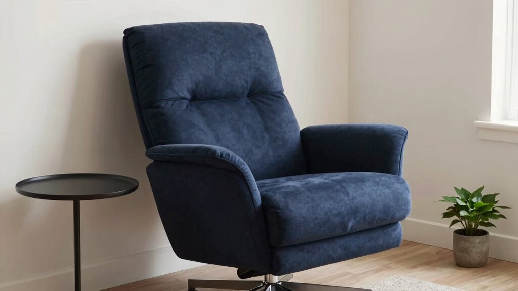 The maximum weight capacity of these wall hugger recliners typically ranges from 250 to 350 pounds. I always recommend checking each model’s specifications because capacities can vary. For example, some higher-end models support up to 400 pounds, offering extra durability. When selecting a chair, consider your weight and comfort needs to guarantee safety and longevity. Trust me, choosing the right capacity makes a big difference in your overall experience.