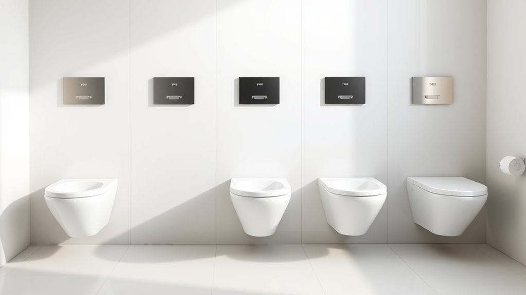 Have you considered how water efficiency influences your choice of wall-hung toilets with in-wall carriers? Opting for dual-flush systems gives you a simple way to cut water use, typically offering 0.8 to 1.6 GPF options. Some in-wall carriers feature dual-flush actuation plates, allowing full or half-flush options for maximum savings. These systems help you meet regulatory standards and earn eco-friendly certifications. The type of flush—gravity or pressure-assisted—also impacts water consumption and flushing power. Choosing efficient models not only reduces your water bills but also lessens your environmental footprint. Properly selecting a water-saving toilet guarantees you don’t sacrifice performance while making your bathroom more sustainable and cost-effective. It’s a smart step toward a greener, more efficient home.