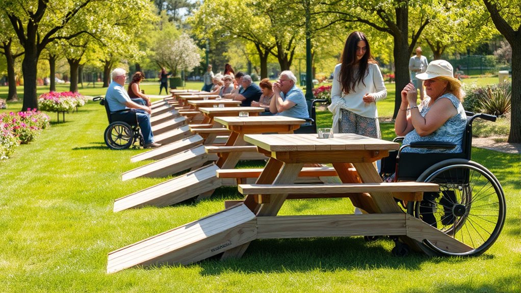 If you’re searching for the 15 best wheelchair-accessible picnic tables, you’ll find options designed for comfort, durability, and ease of use. From lightweight, foldable tables with built-in holders to sturdy, heavy-duty models with adjustable heights and ADA compliance, there’s something for every outdoor setting. Many feature weatherproof materials and safety-enhancing elements like non-slip feet. Keep exploring to discover detailed features and tips to choose the perfect table for your needs.