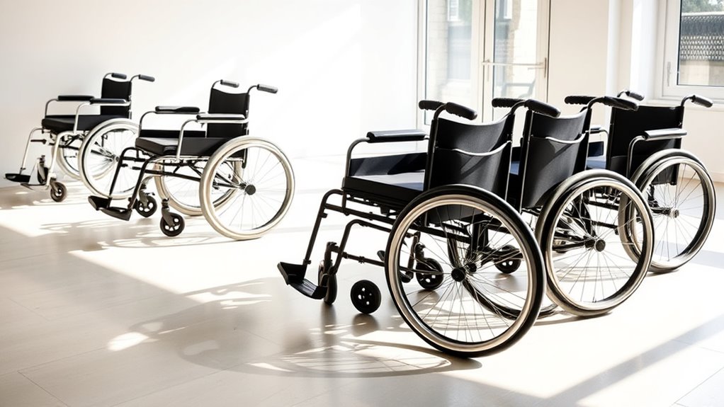 After considering portability and storage, the next vital factor I focus on is the type of wheels and materials used in wheelchairs designed for indoor use. I’ve found that solid rubber wheels are excellent for low maintenance and smooth operation on indoor surfaces, as they’re puncture-proof. If comfort is a priority, pneumatic wheels are air-filled, providing better shock absorption on uneven floors, but they do require regular inflation. Then there are polyurethane wheels, which blend the benefits of rubber and plastic, offering durability and a smooth ride while resisting wear and tear. The wheel material affects maneuverability, noise levels, and stability, all essential for a safe and efficient indoor experience. Choose wisely for the best comfort!