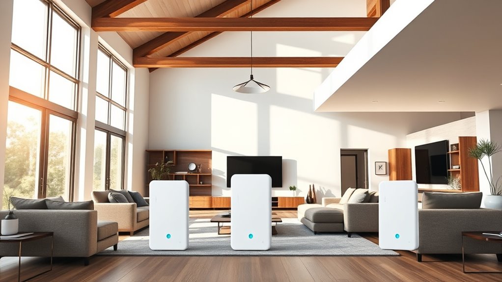 Choosing the right whole-home Wi-Fi mesh system starts with understanding your home’s size and layout. I recommend measuring your total square footage to verify the system can reliably cover your entire space without dead zones. Consider how many floors you have and the complexity of your layout, as multi-story homes typically need more nodes for seamless coverage. Check each node’s maximum coverage area to confirm it meets or exceeds your home’s size. Keep in mind that walls, furniture, and building materials can weaken signals, so choosing a system with support for Ethernet backhaul and higher throughput helps maintain strong, consistent coverage. By evaluating these factors, you’ll select a system capable of delivering reliable, extensive Wi-Fi throughout your large house.