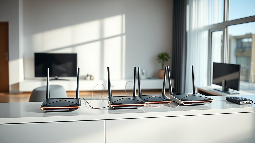 Think of Wi-Fi 7 mesh systems as the conductor leading a symphony of smart home devices. They support multiple gadgets efficiently, ensuring each one gets a clear signal without missing a beat. With higher bandwidth and smarter routing, I find these systems handle your smart lights, thermostats, and security cameras seamlessly. They keep everything in harmony, so your smart home runs smoothly without hiccups or lag.