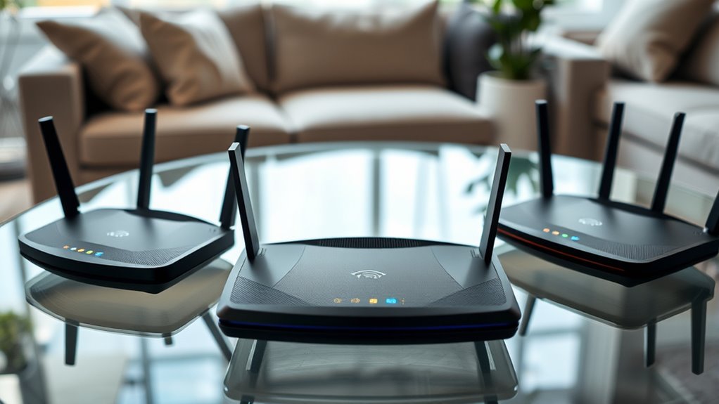 Dual-band routers operate on two frequencies—2.4 GHz and 5 GHz—offering solid coverage and speed for most homes. Tri-band routers add an extra 5 GHz band, reducing congestion and improving overall coverage, especially in larger spaces or with many devices. I find tri-band routers ideal if you have a smart home or multiple users streaming simultaneously, as they guarantee a stronger, more consistent signal across your entire area.