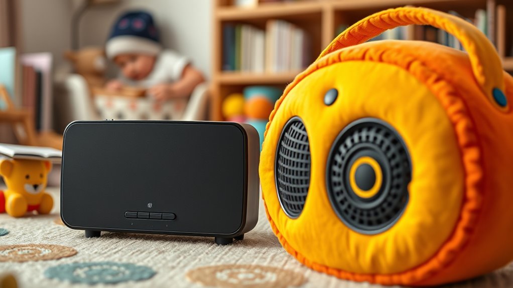In comparing Yoto and Toniebox in 2025, I see that Yoto offers a versatile platform with digital content, customizable options, and features like nightlights and thermometers, perfect for older or tech-savvy kids. Toniebox shines with its durable, tactile design and a wide array of collectible figurines, ideal for active, younger children. Both prioritize safety and screen-free fun, but each has unique strengths. Keep exploring to discover which one might be best for your family’s needs.